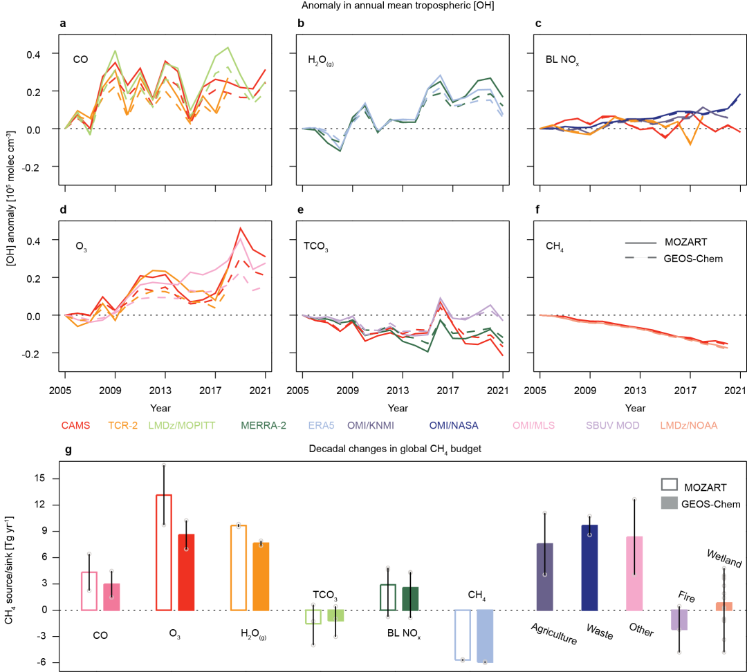 基于这一出乎意料的发现,团队有了新的研究灵感。既然2021年野火对甲烷的影响甚微,为何不拓宽研究领域,不局限于野火和仅一年的时间维度,开展关于全球长时间尺度OH自由基全方位影响因素的综合评估研究呢?