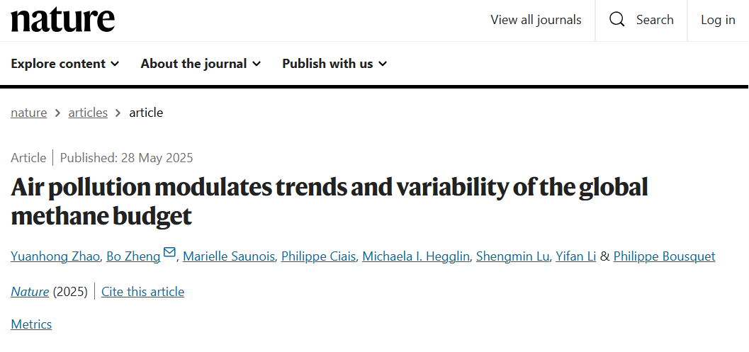 5月28日,研究成果以“大气污染影响全球甲烷收支的趋势和年际变化”(Air pollution modulates trends and variability of the global methane budget)为题,发表在《自然》(Nature)期刊上。该研究不仅关切了大气污染和气候变化的重要课题,而且创新性地提出了减污和降碳的融汇,为“减污降碳”赋予了全新内涵。